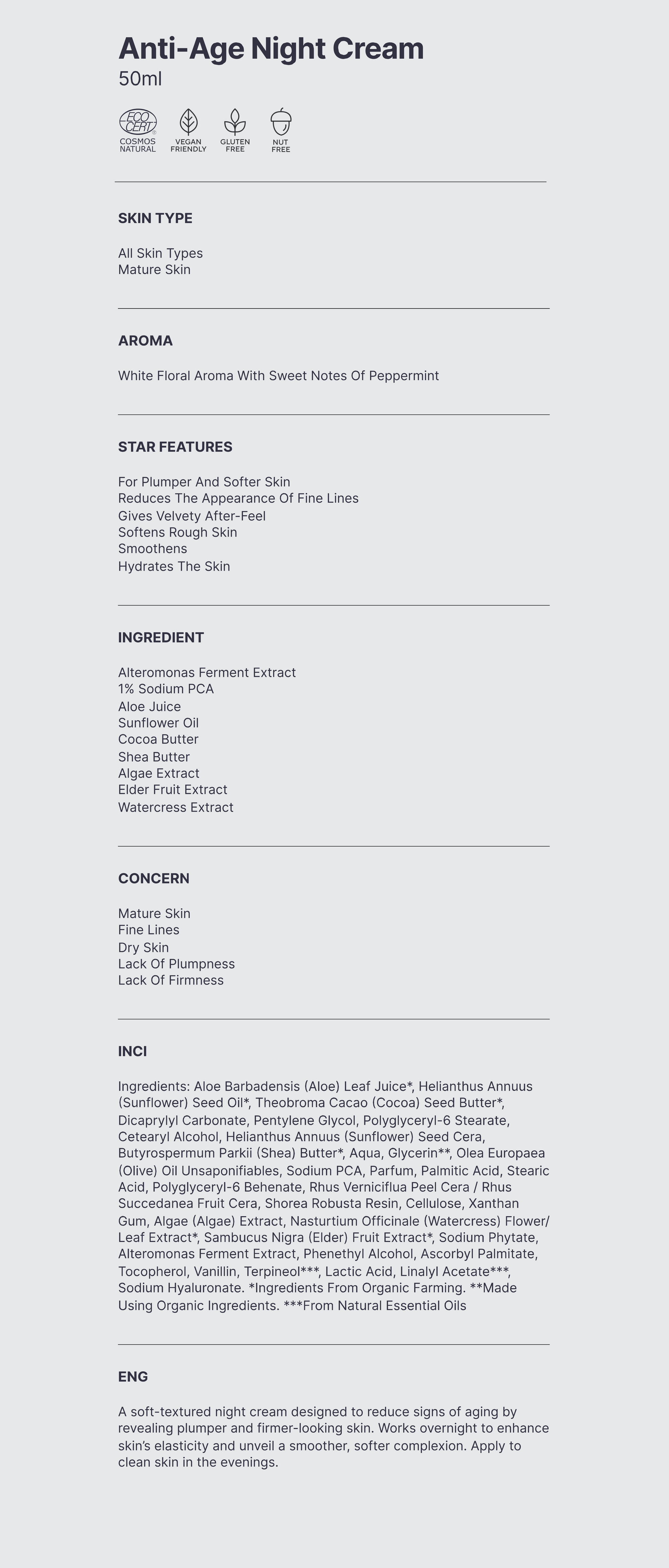 Our Anti-Age Night Cream is a rich, restorative formula crafted to support skin’s natural repair process overnight. Infused with Aloe Vera, Sunflower Oil, Cocoa Butter, and Shea Butter, it delivers deep nourishment while strengthening the skin barrier for a smoother, more resilient complexion.