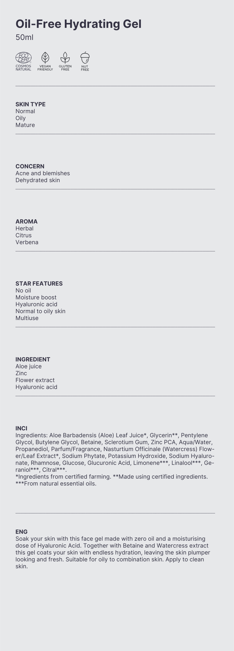 Our Oil-Free Hydrating Gel is a refreshing, fast-absorbing moisturizer designed to deliver lasting hydration without clogging pores. This innovative gel formula combines the soothing power of Aloe Vera with the moisture-locking benefits of Hyaluronic Acid and Glycerin, leaving your skin calm, soft, and hydrated all day long.