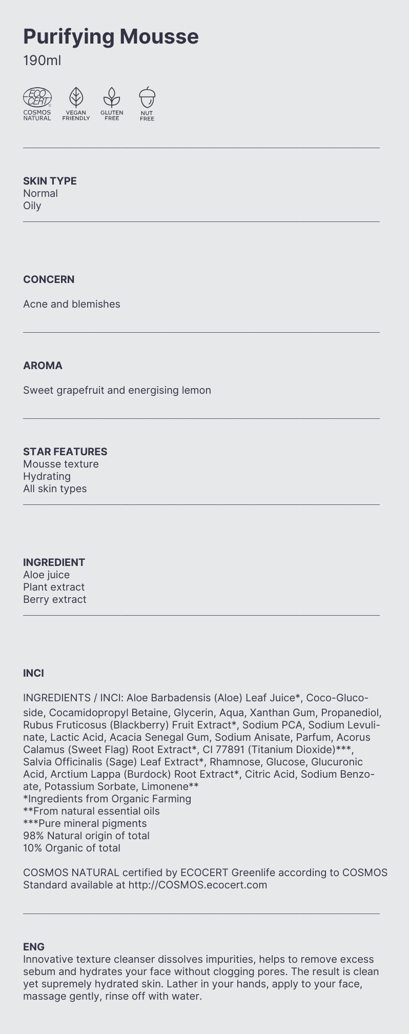 Our Purifying Mousse is a gentle yet effective foaming cleanser that lifts away impurities, excess oil, and makeup without stripping the skin. Its airy mousse texture provides a refreshing cleanse while maintaining skin’s natural moisture balance.