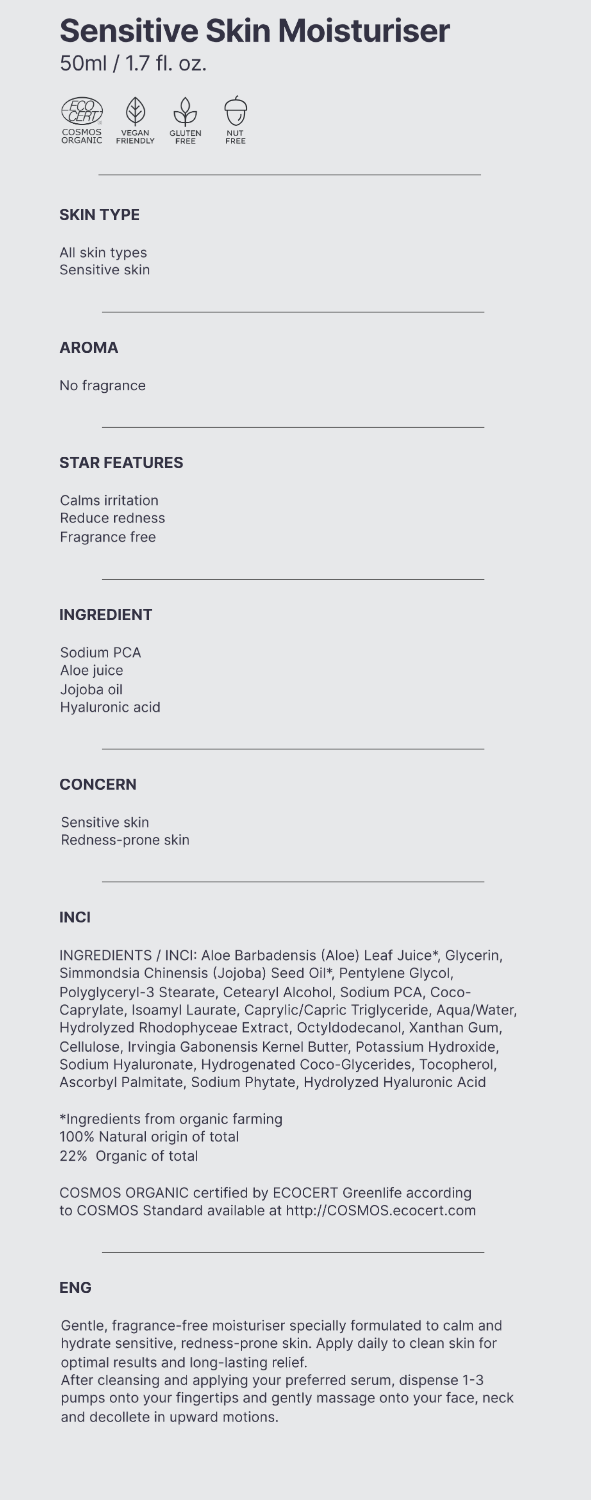 Our Sensitive Skin Moisturizer is a soothing, lightweight cream that replenishes moisture while respecting the needs of delicate skin. With a soft, calming texture, it absorbs quickly to deliver long-lasting hydration and protection, without heaviness or irritation.