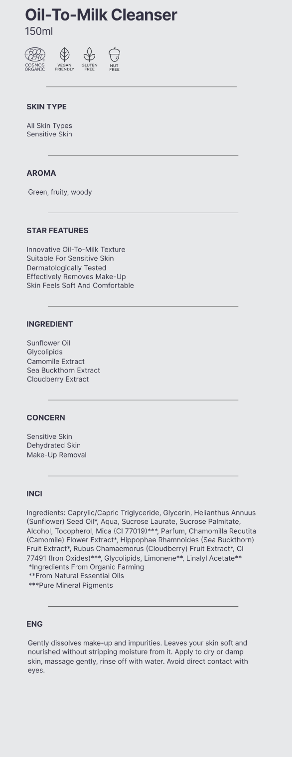 Our Sensitive Skin Oil-To-Milk Cleanser is a silky oil-based formula that transforms into a lightweight cleansing milk upon contact with water. Designed especially for delicate and reactive skin, it melts away makeup, sunscreen, and impurities while preserving the skin’s natural balance.