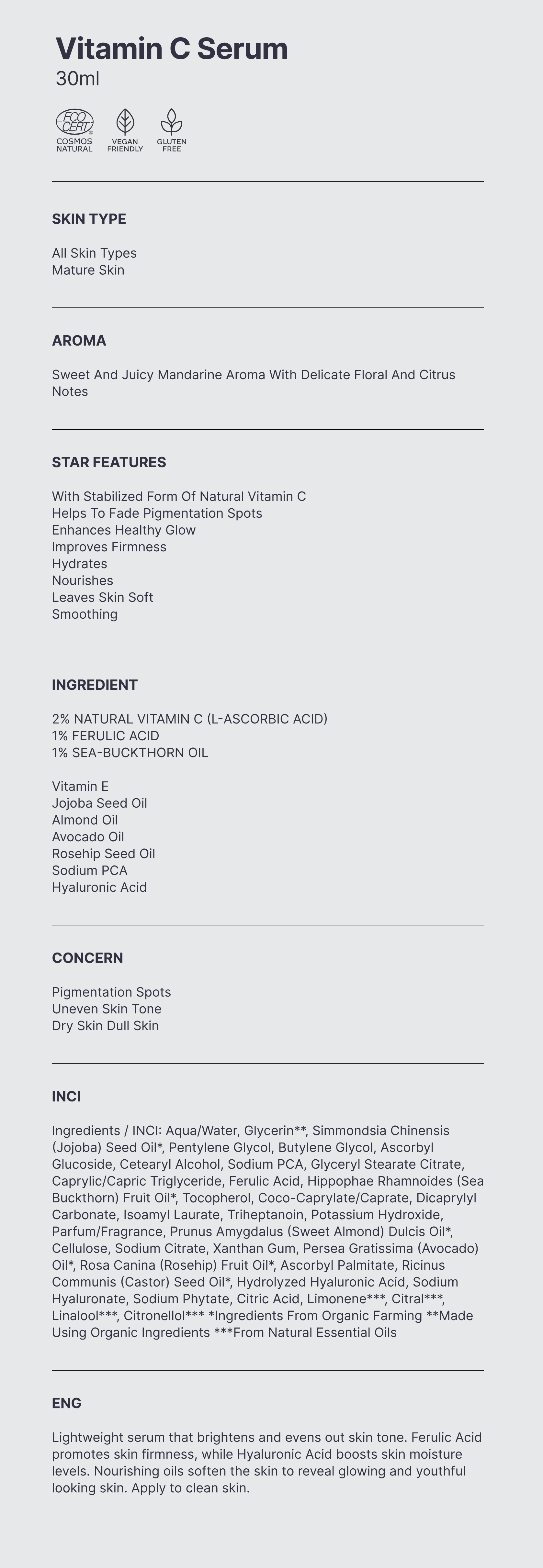 Formulated with Vitamin C and boosted with Ferulic Acid and Vitamin E, this serum helps reduce dullness, smooth uneven texture, and support collagen for a firmer, more luminous complexion. Organic oils including Sea Buckthorn, Rosehip, Almond, Avocado, and Jojoba provide antioxidant nourishment and barrier support. Multi-weight Hyaluronic Acid replenishes moisture and plumps fine lines for a healthy glow.